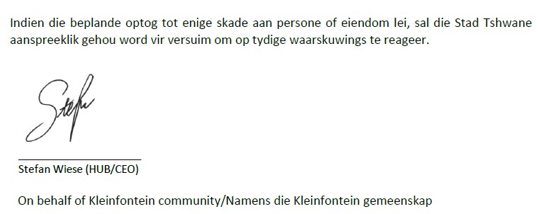 Verder wil dit voorkom asof die EFF beoog om tydens hul optog ‘n memorandum aan die Stad Tshwane te oorhandig. Dit bly egter onduidelik waarom die EFF dit nodig ag om teen Kleinfontein te betoog indien hul griewe by die Stad Tshwane lê – des te meer aangesien hulle, tesame met die ANC, Tshwane regeer.